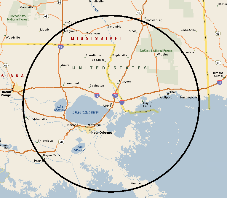 Pascagoula, MS, including the entire New Orleans metro area.  If you are